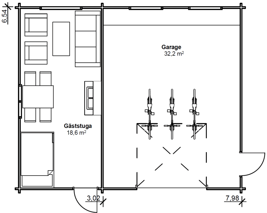 På 25m2 rymmer man mycket. Fjällboda 25 är framtagen som enkel komplementbyggnad där det mesta vardagliga rymms in. Användandet kan vara som förråd eller garage, med innermåtten 5,5×3,6 i garagedelen går de flesta bilar in.
